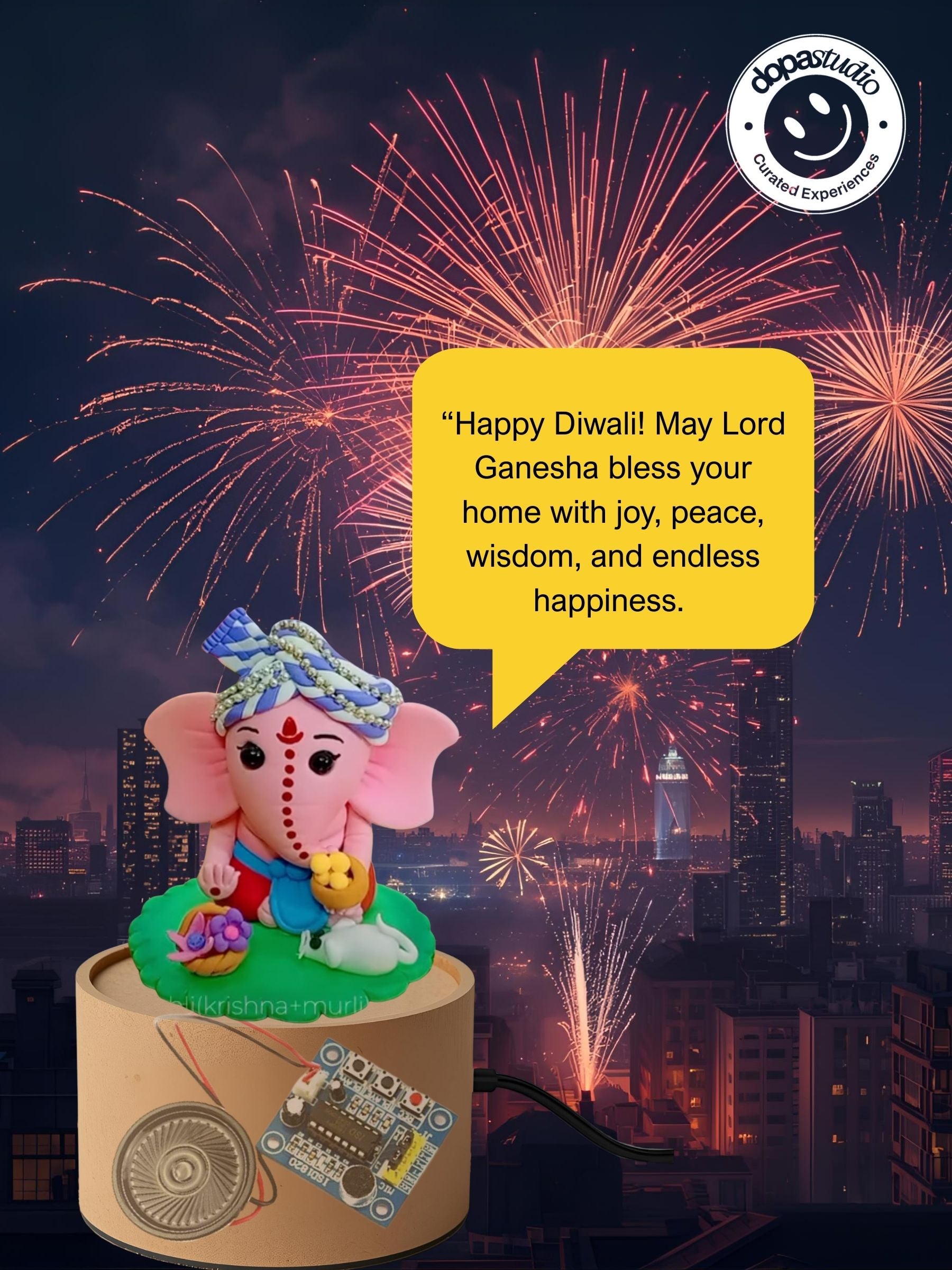 You’ll begin by sculpting a 4–5 inch figure or design of your choice using air-dry clay, guided by your host or inspired by references. It could be festive (like a Ganesha idol), playful (like a Minion), or personal (like a heart, rocket, or pet). Once your creation is ready, you’ll assemble a compact voice recording module with USB power and speaker. Record up to 10 seconds of your message — for example: “Happy Diwali! May Ganesha bless you always”, “Bello! I am your Minion, Bananaaa!”, or “Good night, little star, sweet dreams”. Finally, the electronics will be neatly packed into a circular base box with a simple switch to play your recording, and your clay sculpture will be mounted proudly on top.